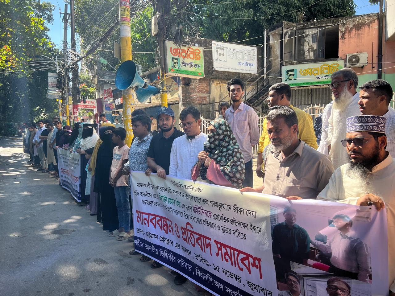 শুক্রবার (১৫ নভেম্বর) সকাল ১১টার সময় চট্টগ্রাম প্রেসক্লাবের সামনে মহেশখালী উপজেলা যুবদলের সাবেক ক্রীড়া বিষয়ক সম্পাদক শহীদ তানভীরের বড় ভাই জিয়াউর রহমান জিয়ার নিঃশর্ত মুক্তির দাবিতে আয়োজিত মানববন্ধনে এ দাবি জানান শহীদ তানভীর সিদ্দিকীর স্বজন, এলাকাবাসী ও ছাত্র জনতা। এলাকাবাসী ও কলেজ শিক্ষার্থীরা উক্ত মানববন্ধনের আয়োজন করেন।