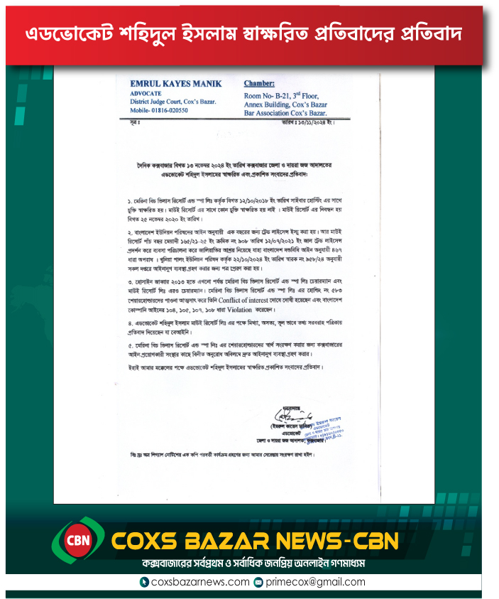 দৈনিক কক্সবাজার বিগত ১৩ নভেম্বর ২০২৪ ইং তারিখ কক্সবাজার জেলা ও দায়রা জজ আদালতের এডভোকেট শহিদুল ইসলামের স্বাক্ষরিত এবং প্রকাশিত সংবাদের প্রতিবাদ: