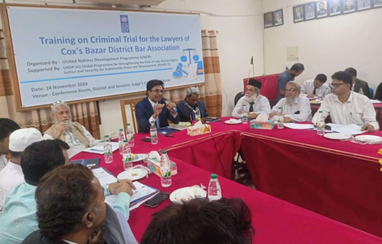 সোমবার (১৮ নভেম্বর) কক্সবাজার জেলা জজ আদালতের সম্মেলন কক্ষে জাতিসংঘের উন্নয়ন বিষয়ক সংস্থা ইউএনডিপি’র উদ্যোগে আয়োজিত “Training on Criminal Trial for the Lawyers of Cox’s Bazar District Bar Association” শীর্ষক এক প্রশিক্ষণ কোর্সের উদ্বোধনী অনুষ্ঠানে প্রধান অতিথির বক্তব্যে কক্সবাজারের জেলা ও দায়রা জজ মুনসী আব্দুল মজিদ একথা বলেন।