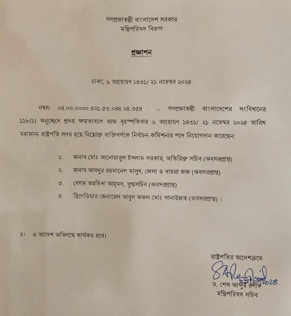 অনুরূপভাবে একইদিন মন্ত্রীপরিষদ সচিব ড. শেখ আবদুর রশিদ স্বাক্ষরিত পৃথক আরেকটি প্রজ্ঞাপনের মাধ্যমে রাষ্ট্রপতি ৪ জন নির্বাচন কমিশনার নিয়োগ দিয়েছেন। তাঁরা হলেন- সরকারের সাবেক অতিরিক্ত সচিব মোঃ আনোয়ারুল ইসলাম, সাবেক জেলা ও দায়রা জজ আবদুর রহমান মাসুদ, সরকারের সাবেক যুগ্মসচিব তাহমিদা আহমদ ও ব্রিগেডিয়ার জেনারেল (অব:) আবুল ফজল মোঃ সানাউল্লাহ।