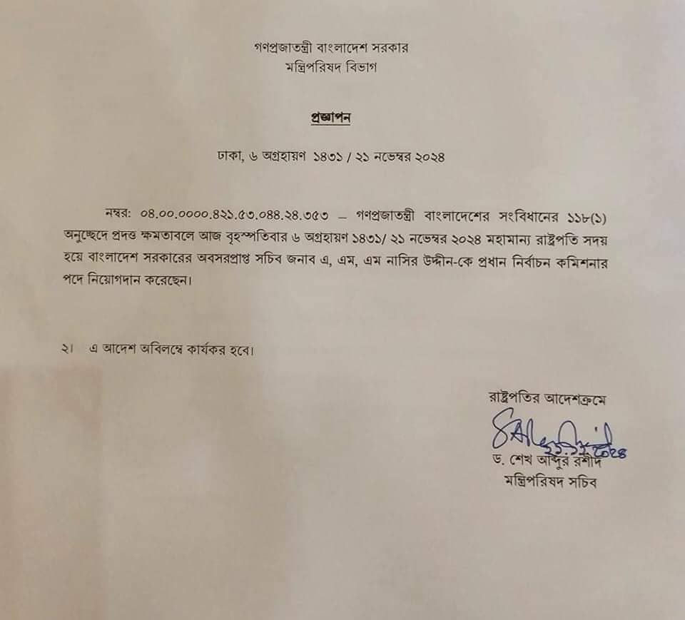 বৃহস্পতিবার (২১ নভেম্বর) মন্ত্রীপরিষদ সচিব ড. শেখ আবদুর রশিদ স্বাক্ষরিত এক প্রজ্ঞাপনে এ.এম.এম নাসির উদ্দীন-কে এ নিয়োগ প্রদানের কথা জানানো হয়। প্রজ্ঞাপনে বলা হয়, রাষ্ট্রপতি সংবিধানের ১১৮ (১) অনুচ্ছেদে প্রদত্ত ক্ষমতাবলে এ.এম.এম নাসির উদ্দীন-কে দেশের প্রধান নির্বাচন কমিশনার পদে নিয়োগ প্রদান করেন। নতুন প্রধান নির্বাচন কমিশনার পদে নিয়োগ পাওয়া এ.এম.এম নাসির উদ্দীন কক্সবাজারের কুতুবদিয়া উপজেলার বাসিন্দা।