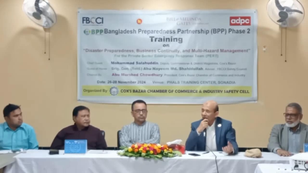 এসময় এফবিসিসিআই সেইফটি কাউন্সিলের উপদেষ্টা ব্রিগেডিয়ার জেনারেল (অবঃ) আবু নাঈম মোঃ শাহিদউল্লাহ “বাংলাদেশ প্রিপেয়ার্ডনেস পার্টনারশীপ” (বিপিপি) প্রকল্পের বিভিন্ন কার্যক্রম তুলে ধরেন। তিনি প্রকল্পে আর্থিক সহায়তার জন্য বিল এন্ড মেলিন্ডা গেটস ফাউন্ডেশনকে এবং কারিগরি সহায়তা প্রদানের জন্য এশিয়ান ডিজাস্টার প্রিপেয়ার্ডনেস সেন্টার (এডিপিসি) কে ধন্যবাদ জ্ঞাপন করেন। এছাড়া প্রশিক্ষণ আয়োজনে জেলা ত্রাণ ও পুনর্বাসন দপ্তর, ফায়ার সার্ভিস ও সিভিল ডিফেন্স, এবং কক্সবাজার চেম্বার অফ কমার্স এন্ড ইন্ডাস্ট্রি সেইফটি সেল সহ অন্যান্যদের প্রতি কৃতজ্ঞতা প্রকাশ করেন।