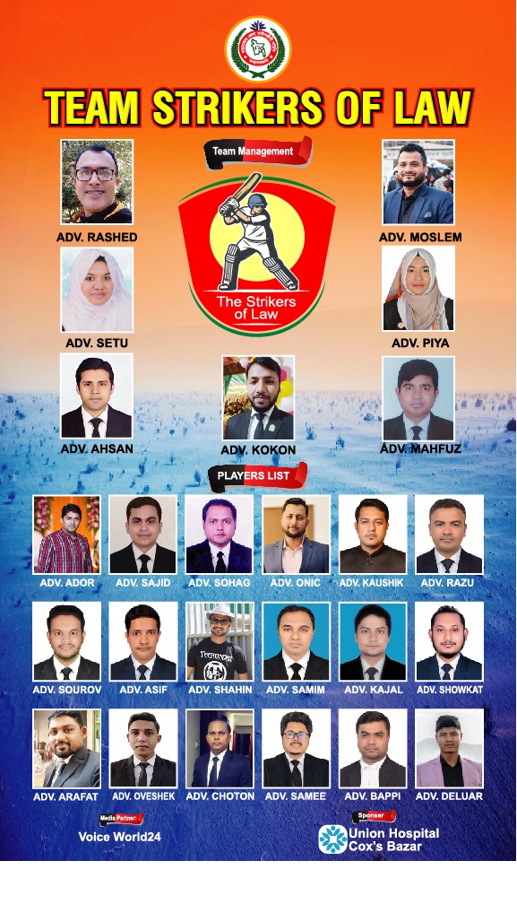 বার্ষিক ক্রীড়া প্রতিযোগিতার জন্য ক্রিকেট দল ঘোষণা করেছে টিম স্ট্রাইকারস অফ ল। এই দলে মোট ২৫ জন আইনজীবী অংশগ্রহণ করছেন। টিমের সিইও হিসেবে রয়েছেন অ্যাডভোকেট মোঃ সাজিদ আবেদীন (এপিপি)।