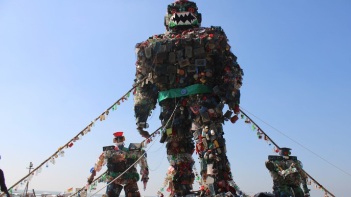 ৬২ ফুট উচ্চতার এ রোবটটি নির্মাণে ব্যবহার করা হয়েছে ১০ মেট্রিক টন সামুদ্রিক প্লাস্টিক। পাশাপাশি দুটি ছোট আকৃতির দানবও তৈরি করা হয়েছে।