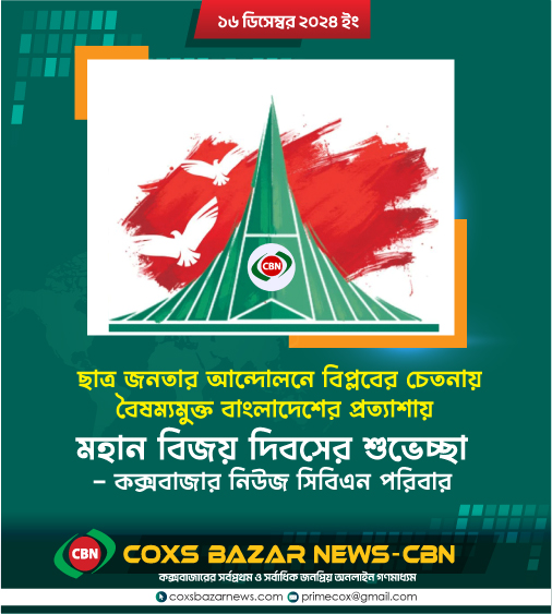 আজকের এ দিনে ২০০৯ সালে প্রতিষ্ঠিত কক্সবাজারের প্রথম অনলাইন পত্রিকা কক্সবাজার নিউজ (সিবিএন) এর পক্ষ থেকে ৩০ লক্ষ শহীদের প্রতি বিনম্র শ্রদ্ধা । জাতির শ্রেষ্ট সন্তান মুক্তিযোদ্ধাদের প্রতি কৃতজ্ঞতা । সিবিএন’র সকল পাঠককে বিজয় দিবসের শুভেচ্ছা ।