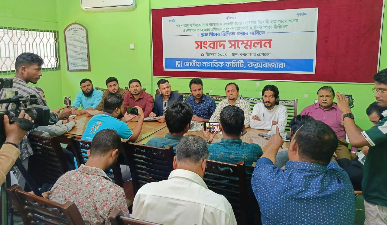 বৃহস্পতিবার (১৯ ডিসেম্বর) দুপুরে কক্সবাজার প্রেসক্লাবে সংবাদ সম্মেলনে দাবিসমূহ উপস্থাপন করে বক্তব্য রাখেন জাতীয় নাগরিক কমিটির কেন্দ্রীয় সদস্য এএসএম সুজা উদ্দিন ও কক্সবাজার সদর থানা প্রতিনিধি কমিটির সংগঠক ওমর ফারুক।