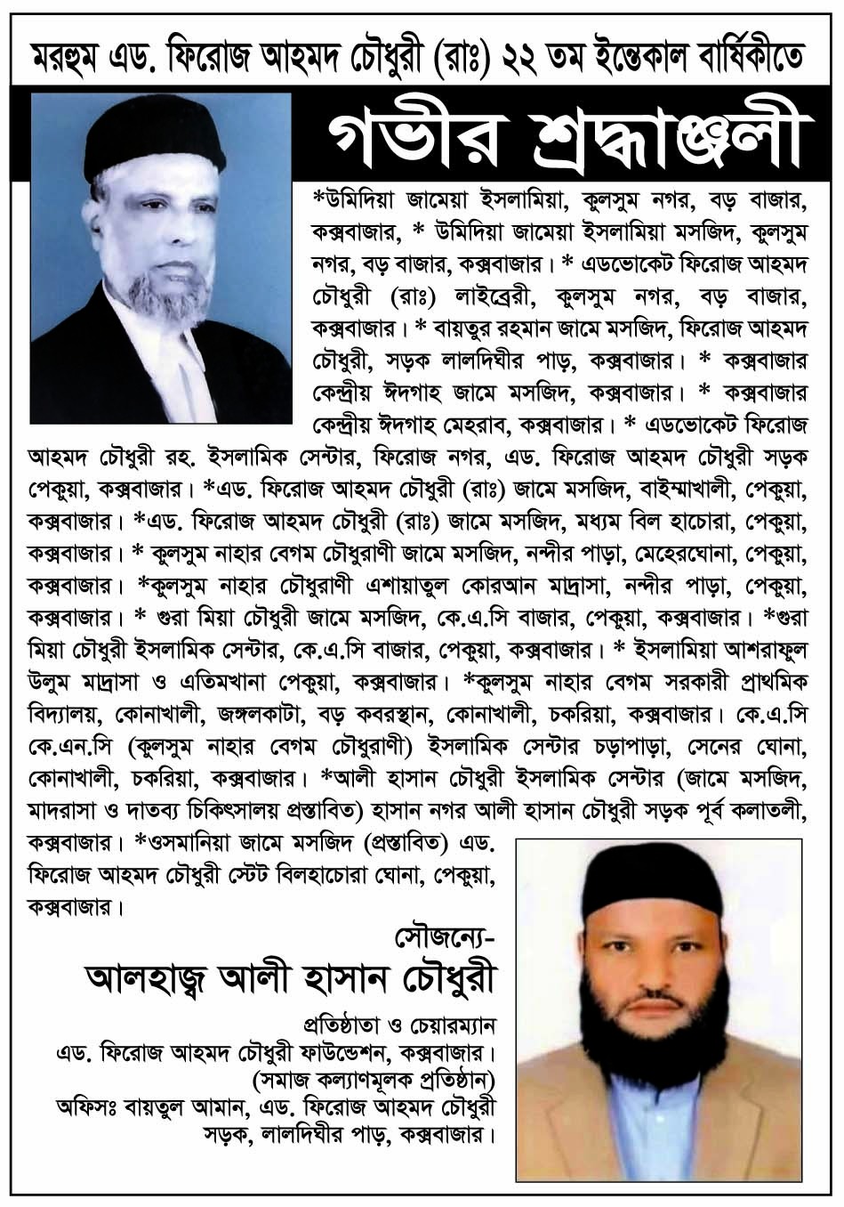 আজ কক্সবাজারের কৃতি সন্তান সাবেক পূর্ব পাকিস্তান আইন পরিষদ সদস্য ও বিশিষ্ট ইসলামী ব্যক্তিত্ব ও আইনজীবী আলহাজ্ব এড. ফিরোজ আহমদ চৌধুরীর ২২তম ইন্তেকাল বার্ষিকী। আজ থেকে ২২ বছর আগে এই দিনে তিনি ইন্তেকাল করেছেন।