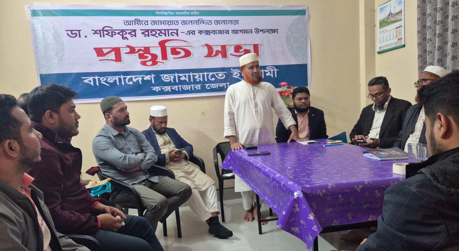 আমীরে জামায়াত ডা. শফিকুর রহমান ৮ ফেব্রুয়ারি ২০২৫ কক্সবাজারে আগমন উপলক্ষ্যে জেলা সাংস্কৃতিক টীমের এক প্রস্তুতি সভা ১৯ জানুয়ারি সন্ধ্যায় হাসপাতাল সড়কস্থ দলীয় কার্যালয়ে অনুষ্ঠিত হয়। জেলা সাংগঠনিক সেক্রেটারি আল আমীন মু. সিরাজুল ইসলামের সভাপতিত্বে অনুষ্ঠিত সভায় প্রধান অতিথি হিসেবে উপস্থিত ছিলেন জেলা জামায়াতের সেক্রেটারি জাহিদুল ইসলাম। প্রধান অতিথি সাংস্কৃতিক কর্মীদের উদ্দেশ্যে ৮ ফেব্রুয়ারি আমীরে জামায়াতের সফর উপলক্ষে সকল কর্মসূচিতে সাংস্কৃতিক পরিবেশনার নির্দেশনা প্রদান করেন। কর্মী সম্মেলন উপলক্ষে থিম সং নির্মাণসহ যাবতীয় সাংস্কৃতিক কর্মকাণ্ড সুচারুভাবে প্রস্তুতি গ্রহণ ও মানসম্মত অনুষ্ঠান পরিবেশনার জন্য প্রয়োজনীয় পরামর্শ প্রদান করেন। সকলের সম্মিলিত অংশগ্রহণে একটি সফল, সুশৃংখল ও জেলাবাসীর প্রত্যাশা পূরণে আয়োজিত কর্মী সম্মেলন এক ঐতিহাসিক ভূমিকা পালন করবে বলে আশাবাদ ব্যক্ত করেন। প্রস্তুতি সভায় আরো বক্তব্য রাখেন কক্সবাজার শহর সেক্রেটারি রিয়াজ মোহাম্মদ শাকিল, বিশিষ্ট সাংস্কৃতিক ব্যক্তিত্ব অধ্যাপক ফরিদুল আলম। সভায় শিল্পী ইকবাল হাসান, অনির্বাণ শিল্পী গোষ্ঠীর পরিচালক আব্দুল গফুরসহ শিল্পী ও সাংস্কৃতিক দায়িত্বশীল বৃন্দ উপস্থিত ছিলেন।