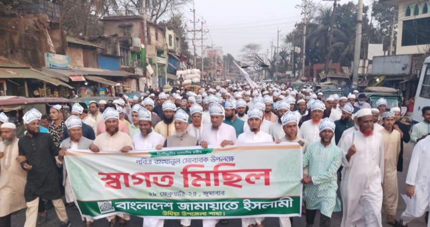 পবিত্র মাহে রামাদান কে স্বাগত জানিয়ে ২৮ ফেব্রুয়ারি জেলাব্যাপী জামায়াতে ইসলামীর বিভিন্ন উপজেলা ও ইউনিয়ন শাখার উদ্যোগে স্বাগত মিছিলের আয়োজন করা হয়। মিছিলোত্তর সমাবেশে বক্তারা বলেছেন, প্রতিবছরের মতো আবারো পবিত্র মাহে রামাদান আমাদের মাঝে উপস্থিত হয়েছে। কুরআন নাজিলের মাস হিসেবে মাহে রামাদান কে কুরআনের সমাজ প্রতিষ্ঠার কাজে লাগাতে হবে। কুর’আনিক সমাজ প্রতিষ্ঠার মাধ্যমে একটি ইনসাফপূর্ণ ও বৈষম্যহীন বাংলাদেশ বিনির্মাণ সম্ভব। সামাজিক, রাজনৈতিক, অর্থনৈতিক ও সাংস্কৃতিক বৈষম্য দূর করতে হলে ইসলামী আদর্শের ভিত্তিতে সমাজকে সাজাতে হবে। মাহে রামাদান আমাদের কে প্রতি বছর সেই ডাক দিয়ে যাচ্ছে। বক্তারা আরো বলেন, রামাদান কে সামনে রেখে এক শ্রেণির অসাধু ব্যবসায়ী নিত্য প্রয়োজনীয় দ্রব্যের মূল্য বৃদ্ধির জন্য মজুদ গড়ে তুলেছে। আমরা অবিলম্বে এ সকল অসাধু ব্যবসায়ী কে আইনের আওতায় এনে দৃষ্টান্তমূলক শাস্তির দাবি জানাচ্ছি। বাজারে নিত্যপ্রয়োজনীয় পণ্যের সরবরাহ স্বাভাবিক রাখতে বাজার মনিটরিং জোরদার করার দাবি জানাচ্ছি। আমরা বাজার এবং সিন্ডিকেট নিয়ন্ত্রণে সরকারের ব্যর্থতা দেখতে চাই না। বক্তারা আরো বলেন, রামাদানের পবিত্রতা রক্ষায় দিনের বেলা হোটেল – রেস্তোরাঁ বন্ধ রাখতে হবে। অনলাইনসহ দোকান-পাট ও সিনেমা হলে অশ্লীলতা ও বেহায়াপনা প্রদর্শনী বন্ধ রাখতে হবে। যথাযথ মর্যাদা ও ভাবগাম্ভীর্যের সাথে রামাদান অতিবাহিত করার নিরাপদ ও শান্তিপূর্ণ পরিবেশ নিশ্চিত করার জন্য বক্তারা অনুরোধ জানান।