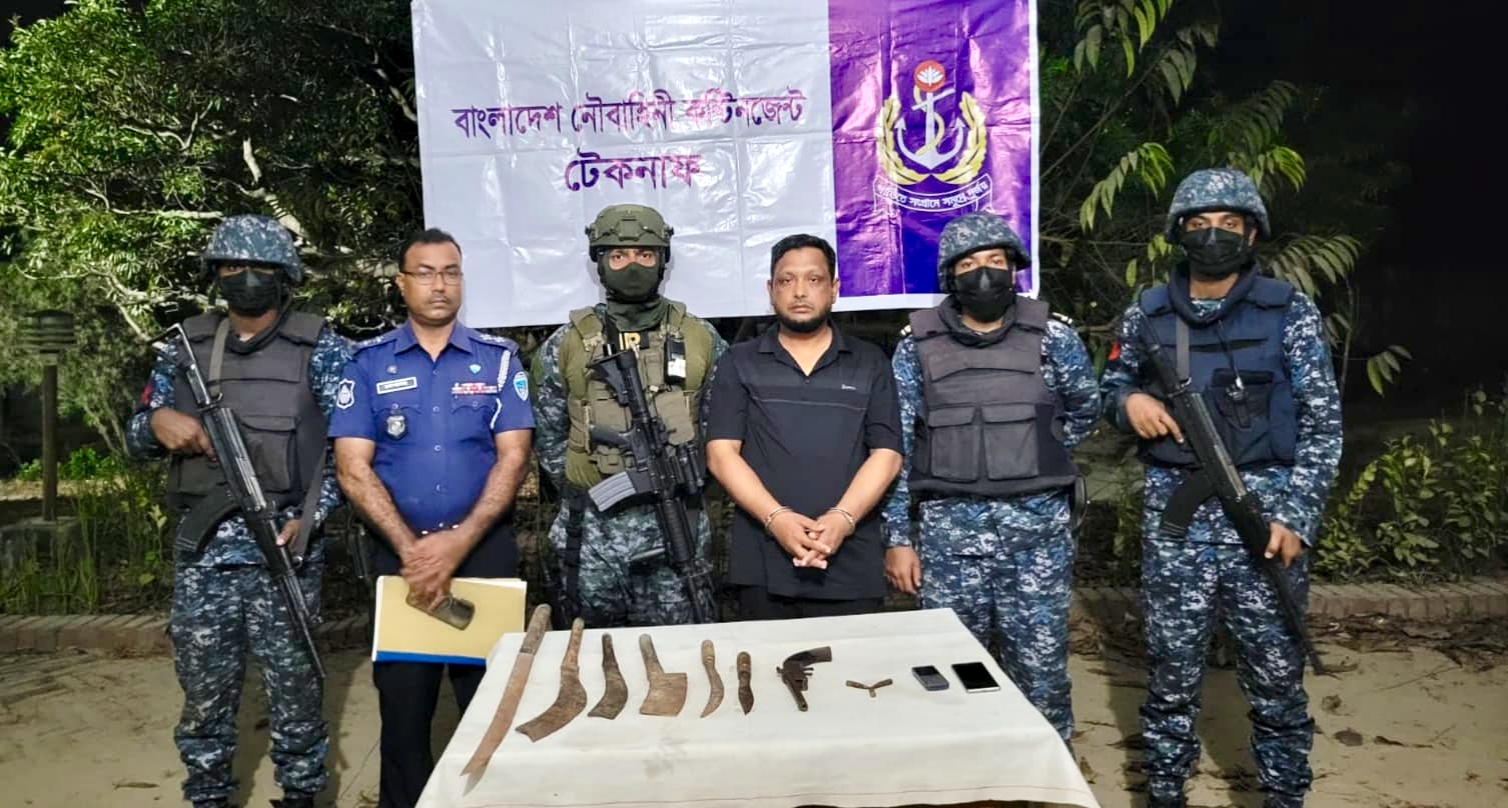 টেকনাফে নৌবাহিনী ও পুলিশ যৌথ অভিযান চালিয়ে বিপুল পরিমাণ অবৈধ অস্ত্রসহ জাহাঙ্গির নামের একজনকে গ্রেফতার করেছে।