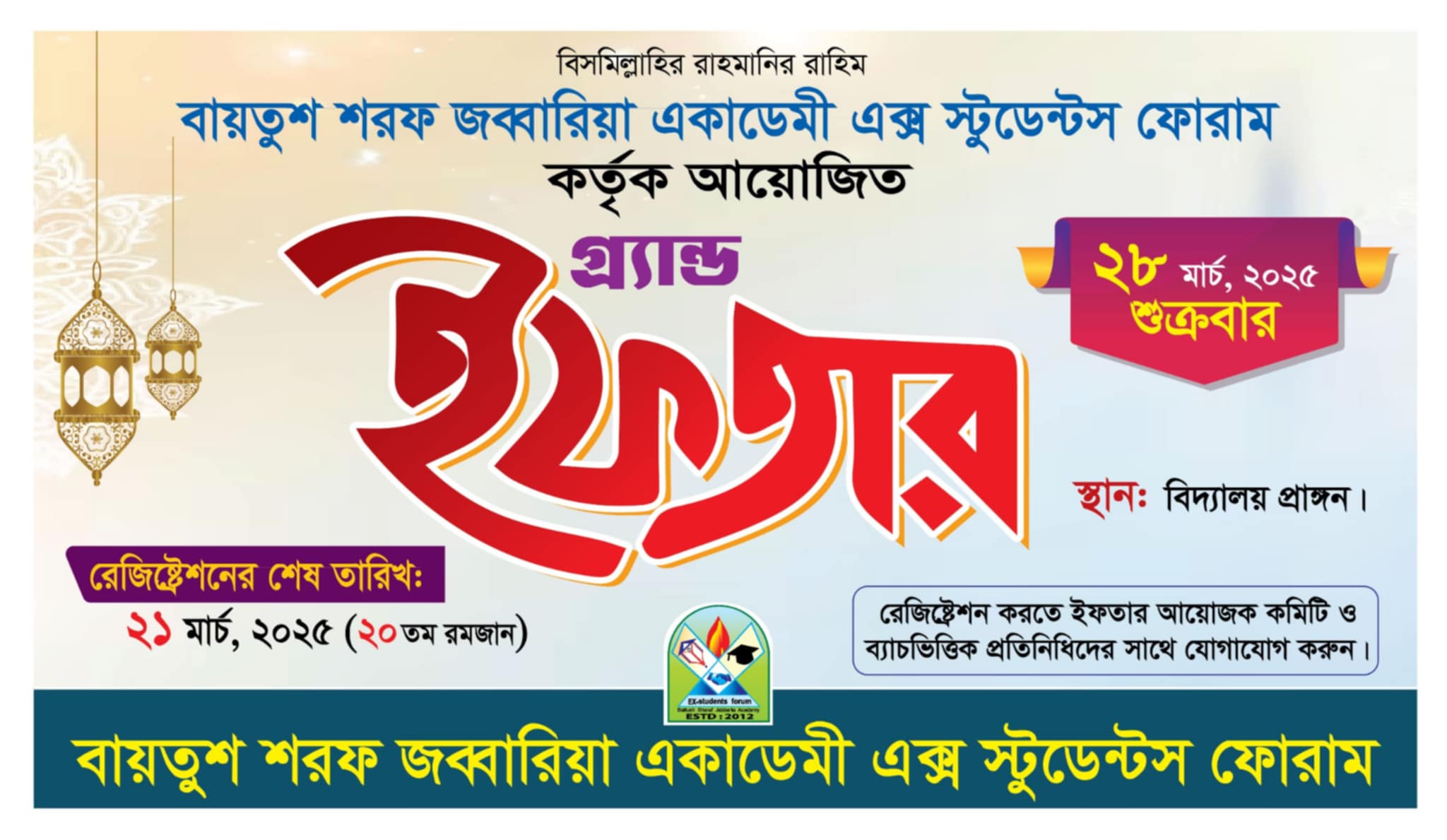 আগামী শুক্রবার (২৮মার্চ) বায়তুশ শরফ জব্বারিয়া একাডেমী প্রাঙ্গনে এই ইফতার আয়োজনে অংশ নিবেন বিদ্যালয়ের সকল ব্যাচের প্রাক্তন শিক্ষার্থীরা।