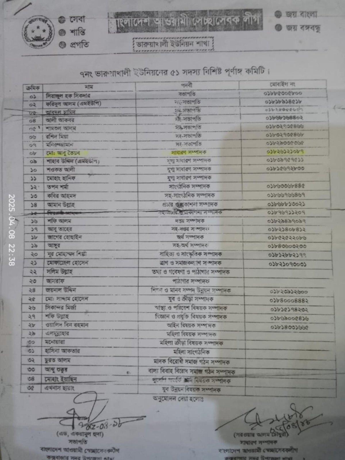 তথ্য অনুসন্ধান করতে গিয়ে ভারুয়াখালী ইউনিয়ন আওয়ামী লীগের একটি কমিটি প্রতিবেদকের হাতে আসে। সদর আওয়ামী লীগের সভাপতি মনিরুল আলম চৌধুরী ও সাধারণ সম্পাদক এসটিএম রাজা মিয়া স্বাক্ষরিত ৫১ সদস্যের কমিটিতে সাহাব উদ্দিন ত্রান ও সমাজ কল্যাণ সম্পাদকের দায়িত্ব পালন করেন।
