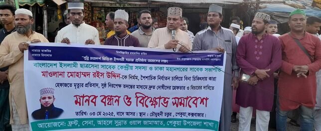 পেকুয়ায় ইসলামী ছাত্রসেনার ঢাকা মহানগরীর সাবেক সভাপতি মাওলানা মোহাম্মদ রইস উদ্দিনের হত্যাকারীদের গ্রেফতার পূর্বক সুষ্ঠু বিচারের দাবিতে মানববন্ধন করে আহলে সুন্নাতে ওয়াল জামাআত পেকুয়া উপজেলা।
