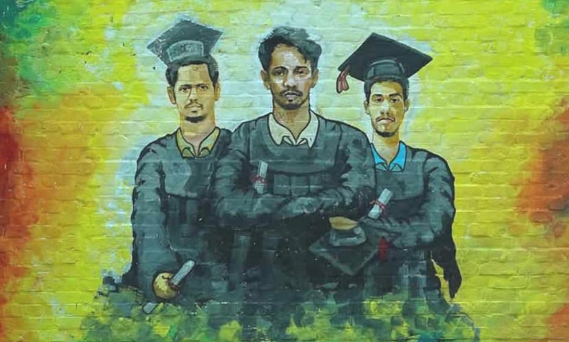 সমাবর্তনের ঠিক আগেই বিশ্ববিদ্যালয়ের সমাজবিজ্ঞান অনুষদের পাশের এক দেয়ালে আঁকা হয়েছে তাদের মুখ। গায়ে কালো গাউন, মাথায় টুপি, হাতে সনদ। মাঝখানে ইতিহাস বিভাগের শহীদ হৃদয় চন্দ্র তরুয়া, পাশে একই বিভাগের ফরহাদ হোসাইন এবং পরিসংখ্যান বিভাগের ফাহিম আহমেদ পলাশ। দেয়ালের এই চিত্র অনেককেই থমকে দেয়, মনে করিয়ে দেয়—সব অর্জন উদযাপন করে যেতে পারেন না সবাই, কেউ কেউ ইতিহাস হয়ে যান।
