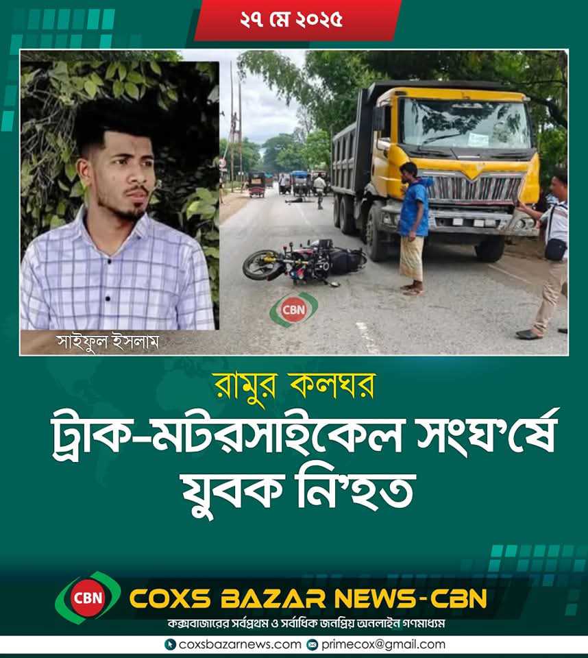 কক্সবাজারের রামুতে বেপরোয়া ট্রাকের চাপায় এক যুবক নিহত হয়েছেন। মঙ্গলবার (২৭ মে) বেলা ৩টার দিকে চট্টগ্রাম-কক্সবাজার মহাসড়কের কলঘর স্টেশনের এন আলম ফিলিং স্টেশনের সামনে এই মর্মান্তিক দুর্ঘটনাটি ঘটে।