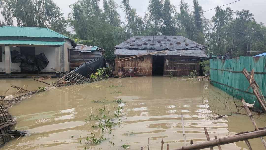 ঘরবাড়ির ভেতরে হাটুসমান পানি জমে থাকায় স্বাভাবিক জীবনযাত্রা সম্পূর্ণভাবে ভেঙে পড়েছে।