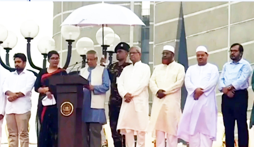 জুলাই অভ্যুত্থানের এক বছর পূর্তিতে ঐতিহাসিক ৫ আগস্ট জাতীয় সংসদের দক্ষিণ প্লাজায় ‘জুলাই পুনর্জাগরণ’ শীর্ষক অনুষ্ঠানে অন্তর্বর্তী সরকারের প্রধান উপদেষ্টা ড. মুহাম্মদ ইউনূস ‘জুলাই ঘোষণাপত্র’ পাঠ করেছেন।