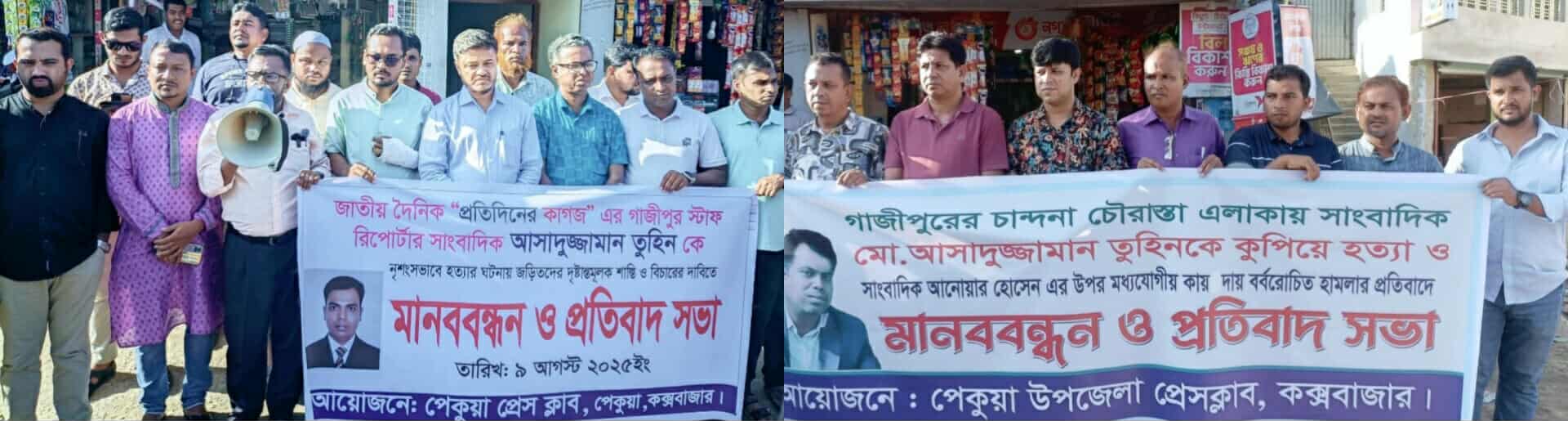 গাজীপুরে সাংবাদিক আসাদুজ্জামান তুহিনকে নির্মমভাবে জবাই করে হত্যা ও অপর সাংবাদিক আনোয়ার হোসেনের ওপর বর্বরোচিত হামলার প্রতিবাদে কক্সবাজারের পেকুয়ায় মানববন্ধন ও প্রতিবাদ সভা অনুষ্ঠিত হয়েছে।