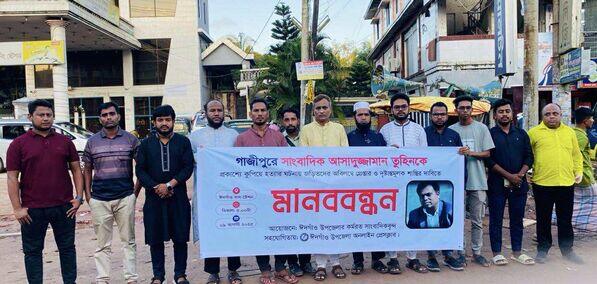 গাজীপুরে সাংবাদিক আসাদুজ্জামান তুহিনকে প্রকাশ্যে কুপিয়ে হত্যার ঘটনায় তীব্র নিন্দা ও প্রতিবাদ জানিয়ে মানববন্ধন করেছেন ঈদগাঁওয়ে কর্মরত সাংবাদিকরা।