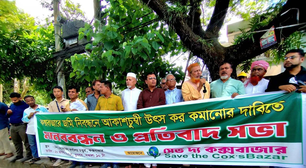 কক্সবাজার জেলায় জমি রেজিস্ট্রিতে আকাশচুম্বী উৎসে কর কমানোর দাবিতে মানববন্ধন ও প্রতিবাদ সভা অনুষ্ঠিত হয়েছে।
