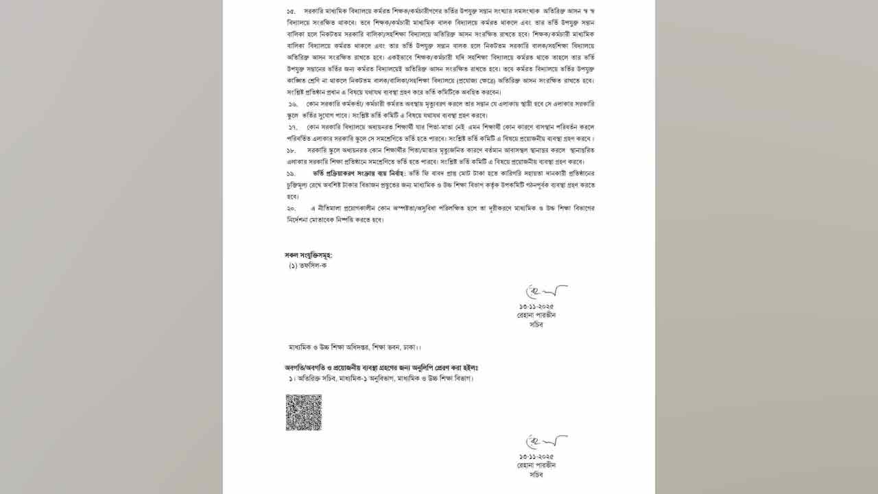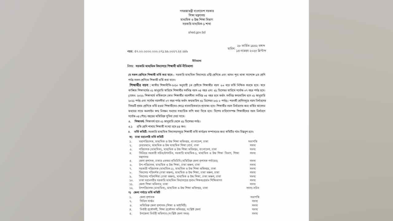 সরকারি মাধ্যমিক বিদ্যালয়ে শিক্ষার্থী ভর্তির নতুন নীতিমালা প্রকাশ করেছে শিক্ষা মন্ত্রণালয়ের মাধ্যমিক ও উচ্চশিক্ষা বিভাগ। বৃহস্পতিবার (১৩ নভেম্বর) জারি করা এ নীতিমালায় আগামী শিক্ষাবর্ষেও ভর্তিতে লটারি পদ্ধতি বহাল রাখা হয়েছে।