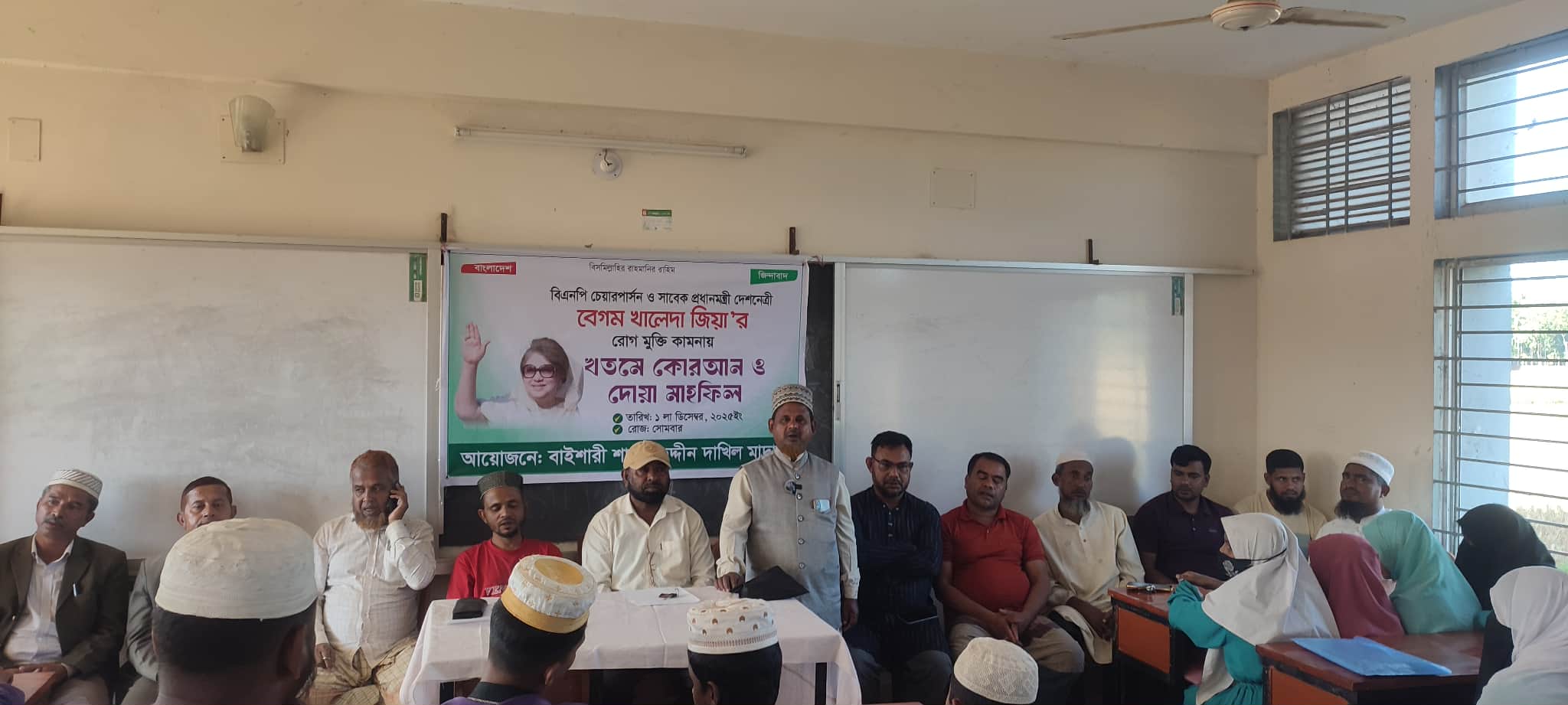 বান্দরবানের নাইক্ষ্যংছড়ি উপজেলার বাইশারী শাহ নুরুদ্দিন দাখিল মাদ্রাসায় সাবেক প্রধানমন্ত্রী ও বিএনপি চেয়ারপারসন দেশনেত্রী বেগম খালেদা জিয়ার সুস্থতা কামনায় খতমে কোরআন, মিলাদ ও দোয়া মাহফিল অনুষ্ঠিত হয়েছে।