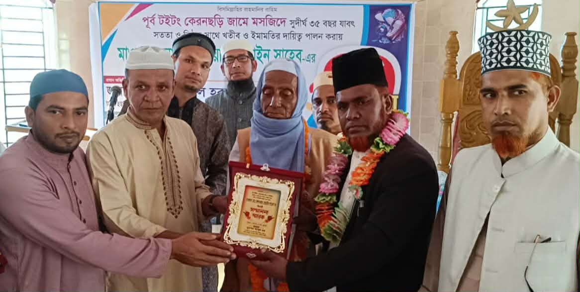 কক্সবাজারের পেকুয়া উপজেলার টইটং ইউনিয়নের পূর্ব টইটং ৪নং ওয়ার্ডের কেরনছড়ি জামে মসজিদের দীর্ঘদিনের ইমাম ও খতিব মাওলানা মো. দেলোয়ার হোছাইনকে অবসর গ্রহণ উপলক্ষে অভূতপূর্ব এক বিদায়ী সংবর্ধনা দিয়েছেন এলাকাবাসী। শুক্রবার (১২ ডিসেম্বর) সকালে মসজিদ প্রাঙ্গণে মসজিদ পরিচালনা কমিটির উদ্যোগে আয়োজিত এ অনুষ্ঠানে উপস্থিত ছিলেন স্থানীয় গণ্যমান্য ব্যাক্তিবর্গ, মসজিদ কমিটির সদস্য, রাজনৈতিক ও সামাজিক নেতৃবৃন্দসহ শতশত মুসল্লি।