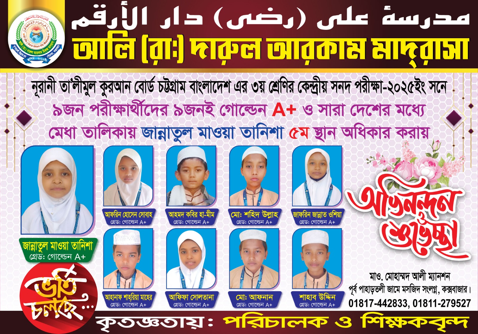 নূরানী তা’লিমুল কুরআন বোর্ড চট্টগ্রামের তৃতীয় শ্রেণীর কেন্দ্রীয় সনদ পরীক্ষায় অসাধারণ সফলতা দেখিয়েছে কক্সবাজার শহরের পূর্ব পাহাড়তলী এলাকায় প্রতিষ্ঠিত আলি (রা:) দারুল আরকাম মাদরাসা।