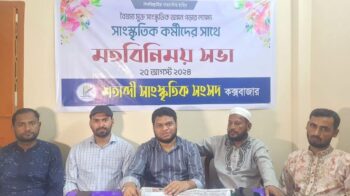 প্রেস বিজ্ঞপ্তি: বৈষম্যমুক্ত সাংস্কৃতিক অঙ্গন গড়ার লক্ষ্যে সাংস্কৃতিক কর্মীদের সাথে এক মতবিনিময় সভার আয়োজন করে শতাব্দী সাংস্কৃতিক সংসদ কক্সবাজার। ২৫ আগস্ট সন্ধ্যায় সংগঠনের অস্থায়ী কার্যালয়ে অনুষ্ঠিত মতবিনিময় সভায় সভাপতিত্ব করেন শতাব্দী সাংস্কৃতিক সংসদের আহ্বায়ক আল আমীন। মতবিনিময় সভায় বক্তারা বলেছেন,